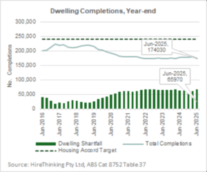 Competitions for year-ending June 2025 were 174,030 which is the first year of the national housing accord target to build 240,000 dwellings per year. The shortfall as at June 2025 was 65,970 dwellings which is 27.5% of the target.