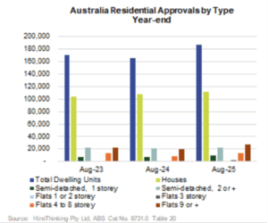Total dwelling approvals for year-ending August were 186,641 an increase of +12.3% over the previous period. Multi-res was leading the charge with approvals for flats 4-8 storey up +56.1% to 13,632 over the period and Flats 9+ storeys up +35.0% to 26,816 for the period.