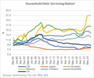 *The debt servicing ratio is defined as the ratio of interest payments and amortisations of principal to gross disposable income plus interest payments. It is calculated under the assumption that debt, excluding the effects of loan-level features such as offset accounts and redraw facilities, is repaid in equal instalments over the average loan maturity (assumed to be 18 years). Includes non-profit institutions serving households. Earliest observation is March quarter 1999 and latest observation is March quarter 2025