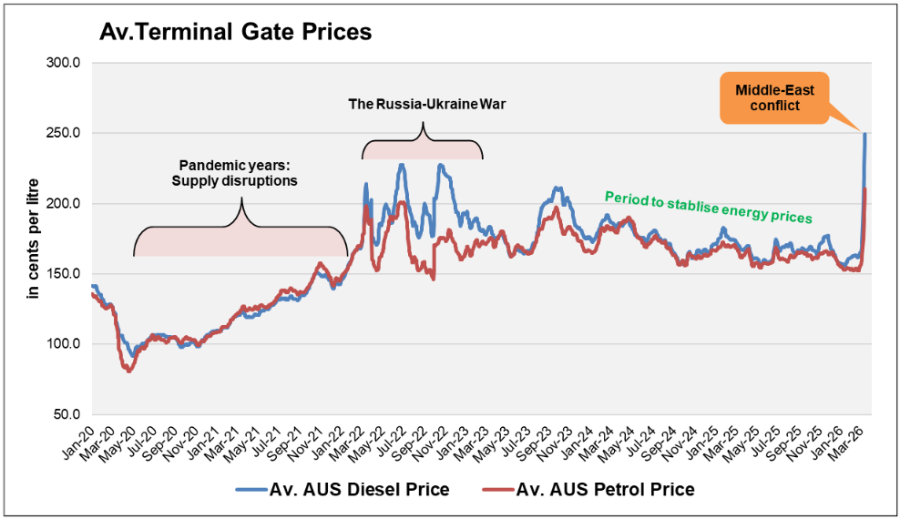 In Australia, the impact has been felt relatively quickly. Wholesale fuel prices, as reflected in Terminal Gate Prices (TGP), show that as of mid-March 2026, diesel prices have increased by approximately 50%, while petrol prices have risen by around 35% (Figure 1). The sharper increase in diesel prices suggests a strong impact, particularly given its critical role in freight, transport, and logistics.