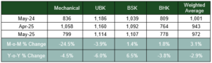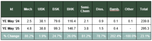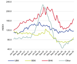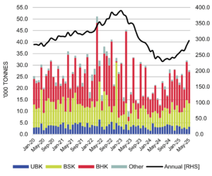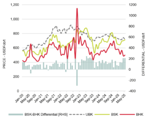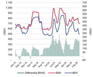 In May 2025, the average BSK price was AUDFob1,107/t while the BHK price was AUDFob778/t, with the differential operating at AUD329/t for the month. In US dollars, the differential was USD212/t.