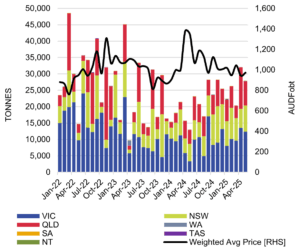 Australian Pulp Imports by State: Jan ’22 – May ‘25 (Tonnes & AUDFob/t)