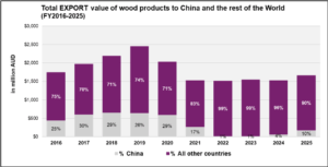 Before the pandemic, Australia’s export value of wood products to China consistently represented around 25% of total wood product exports, averaging between $550 million and $600 million per year. This share reflected China’s importance as a major and stable market for Australian forestry products. However, from 2022 to 2024, exports to China declined sharply. During this period, the share of exports to China fell to as low as 1–4% of total wood product exports, representing a significant shift in the trade relationship.
