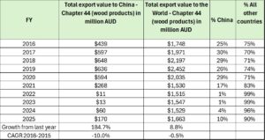 The latest figures for FY2025 indicate a substantial recovery. Exports to China rebounded to $170 million, accounting for 10% of Australia’s total wood product exports. While this remains well below pre-pandemic levels, the recovery signals renewed demand and an improving trade dynamic with China. Table 1 and Figure 1 provide a detailed view of Australia’s wood product exports to China over the past decade, illustrating both the long-term fluctuations and the more recent rebound.