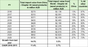 While the total import value of wood products has fluctuated over the past decade, the proportion from China has shown a steady upward trend. Prior to the pandemic, China accounted for around 20% of Australia’s wood product imports. In the last financial year, this share had increased to 27%.