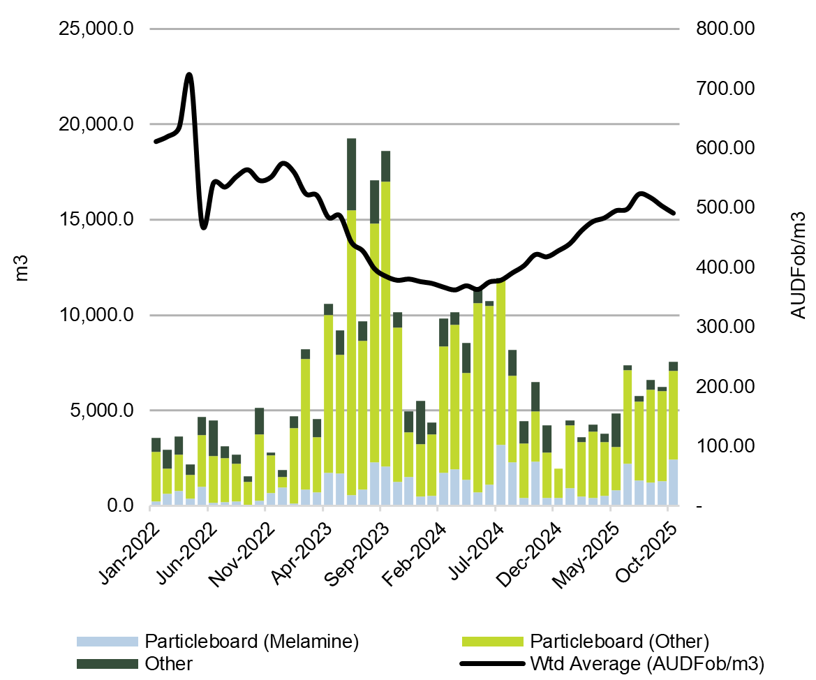 Australian Particleboard Imports: Jan ’22 – Oct ’25 (m3 & AUDFob/m3)
