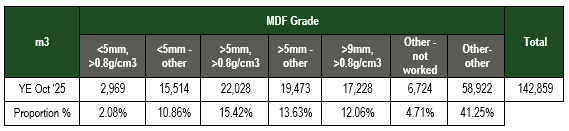 Australia’s imports of Medium Density Fibreboard (MDF) were 17.2% higher year-ended October 2025, compared to the previous year. Imports totalled 142,859 m3 for the year.