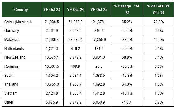 The table below shows the annual import volume for Particleboard imports for the year-ended September 2025.