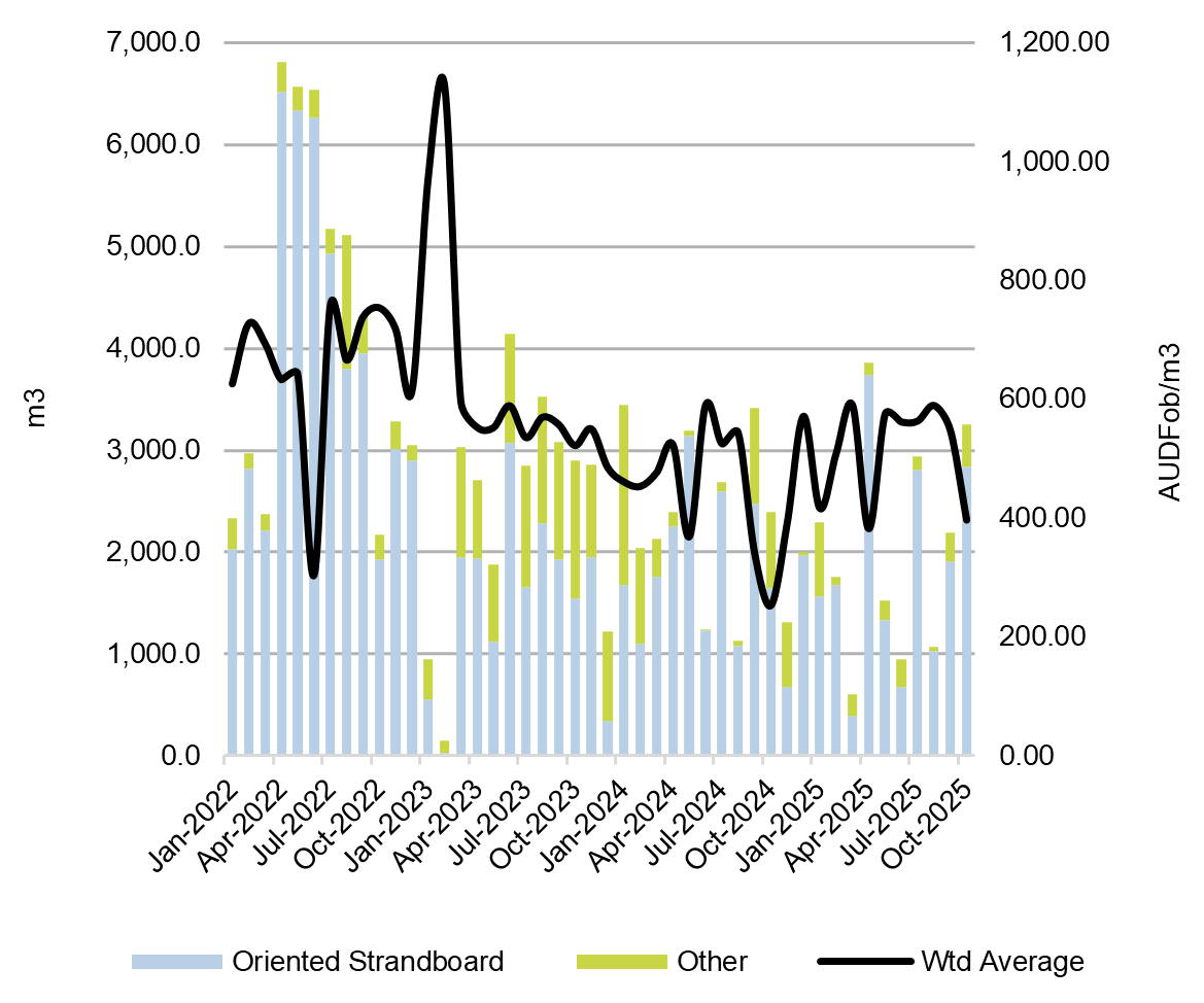 Prices have stabilised since January 2022 and have retained their range from AUDFob400-600/m3 over that period. In October 2025, the weighted average price was AUDFob397.44/m3 or a decrease of 27.5% compared to the month prior.