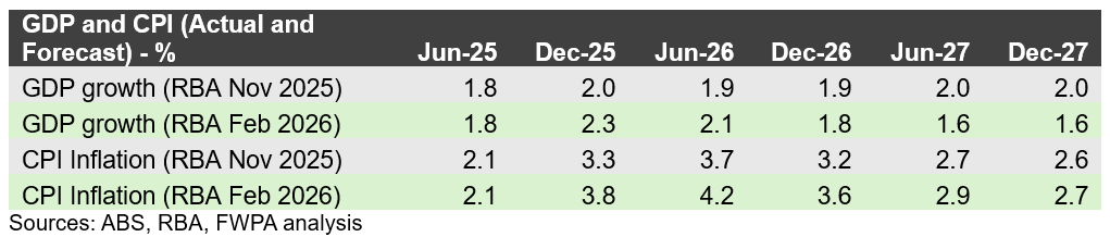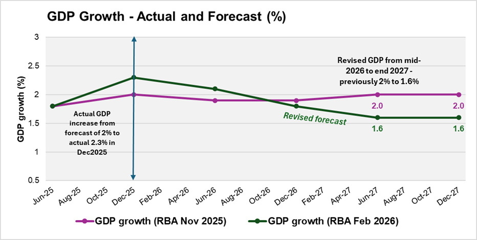 However, the higher-than-expected inflation outcome, exceeding projections by around 0.5 percentage points, has led to a reassessment of the economic outlook. The February 2026 Statement of Monetary Policy shows a significant revision to GDP growth projections. Strong spending from both private households and the Government is now expected to support slightly higher short-term growth, with GDP projected to rise from 2.0% to around 2.3% by December (with official data to be released by the ABS in early March).