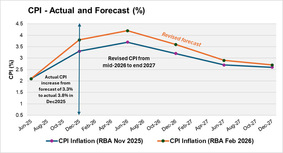 These projections are consistent with the revised inflation outlook, which indicates CPI will remain elevated until mid-2026 before gradually easing back into the RBA’s 2–3% target range (Figure 2).