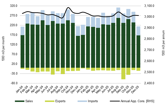 The chart below shows relative stability in total annual apparent consumption over the last two years, when annualised consumption ranged from a low of 2.995 Mm3, to a peak of 3.084 Mm3.