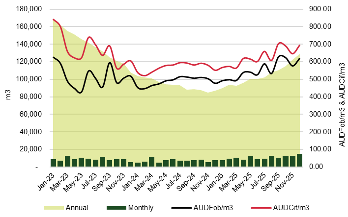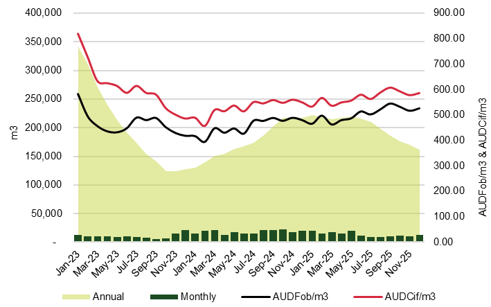 As the chart below shows, the weighted average price of these imports rose from AUDFob466.65/m3 in January 2025, peaking at AUDFob546.08/m3 in September, before finishing the year up 13.0% at AUDFob527.35/m3.