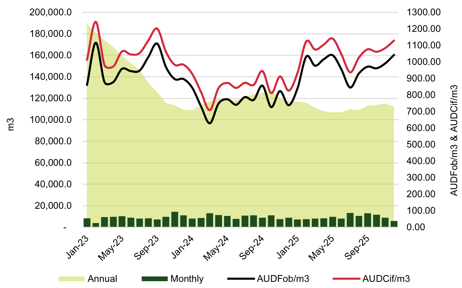 Imports of Dressed, Treated Radiata Pine: Jan ’23 – Dec ’25 (m3, AUDFob/m3 and AUDCif/m3)