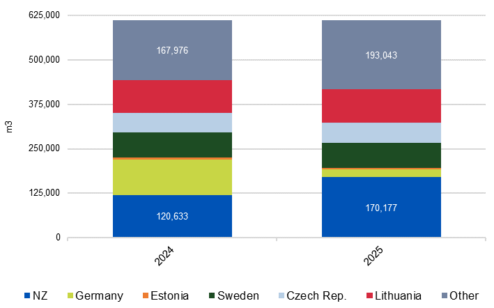 Sawn softwood shipments from New Zealand lifted sharply in 2025, rising 41.1% to 170,177 m3. The trans-Tasman imports accounted for 27.8% of the total, with Lithuania’s 93,560 m3 in second place with 15.3% of total supply.