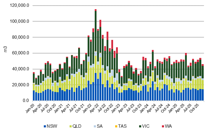 Australian Sawn Softwood Imports by State of Delivery: Jan ’20 – Dec 25 (m3)
