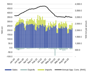 Sawn softwood consumption for the year-ended May 2025 totalled 3.002 million m3, down 1.0% on the prior year. As the chart shows, the decline in consumption has been hugging the 3.0 million m3 mark for the better part of a year, underscoring the wait and see approach of the Australian housing economy.