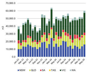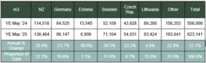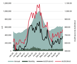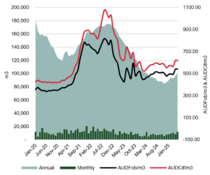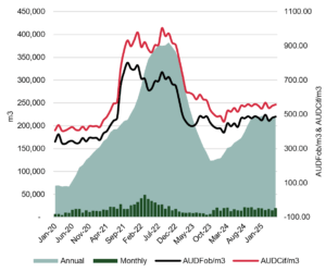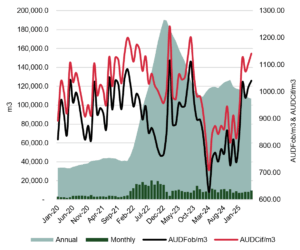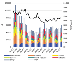 The differential between the two prices shows that freight and insurance costs accounted for AUD100.25/m3 in May 2025, AUD9/m3 lower than the long-term average. New Zealand is the main supplier.