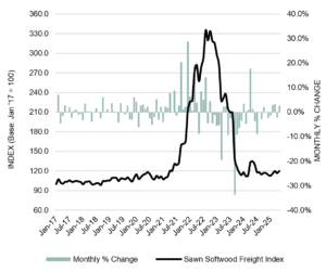 Australian Sawn Softwood Freight Cost Index: Jan ’17 – May ‘25 (INDEX & %)