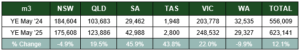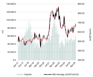 Import volumes were 35.0% higher than one year ago, after plunging at the end of the pandemic inspired boom. Year-ended May, imports totalled 219,627 m3, ending the year priced at AUDFob487.76/m3 or AUDCif556.92/m3 on a landed basis.