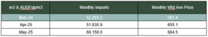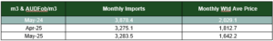 Australian Sawn Softwood Imports: Jan ’20 – May ‘25 (m3 & AUDFob/m3 and AUDCif/m3)