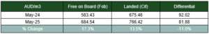 The differential between the two prices shows that freight and insurance costs accounted for AUD69.16/m3 in May 2025, around AUD52/m3 lower than the long-term average for this grade.