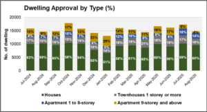 If government incentives continue to align consistently with consumer preferences—such as policies that support affordability, encourage faster approvals, and enable more efficient construction methods—this trend toward medium-density housing will likely persist. This has important implications for how housing supply is delivered, suggesting that future growth may increasingly come from the middle ground between detached houses and high-rise towers. Figure 2 shows the most recent proportions of dwelling approvals by type, highlighting this emerging shift in the housing mix.