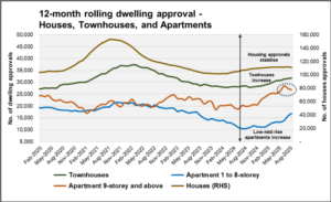 Data from the past three months shows a clear change in dwelling approvals. Approvals for townhouses and low- to mid-rise apartments (up to 8 storeys) have increased significantly, while approvals for high-rise apartments (9 storeys and above) have decreased markedly (Figure 1). This trend indicates a developing shift in residential building, influenced by recent government incentives and evolving preferences among consumers and suppliers.