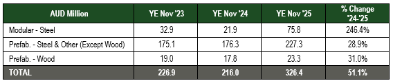 Australia’s imports of prefabricated and modular buildings lifted to a record AUDFob326.4 million year-ended November 2025.