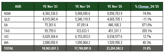 Australian Imports of Wooden Prefabricated Buildings by State: YE Nov ’23 – YE Nov ’25 (AUD & %)