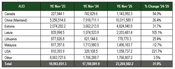 Mainland China dominates total imports of prefabricated buildings, accounting for 66.1% or AUDFob215.9 million year-ended November 2025. However, as the table below demonstrates, imports from China supplied 43.0% of the value of imported wooden prefabricated buildings, able supported by Estonia (20.7%) and Latvia (9.5%)